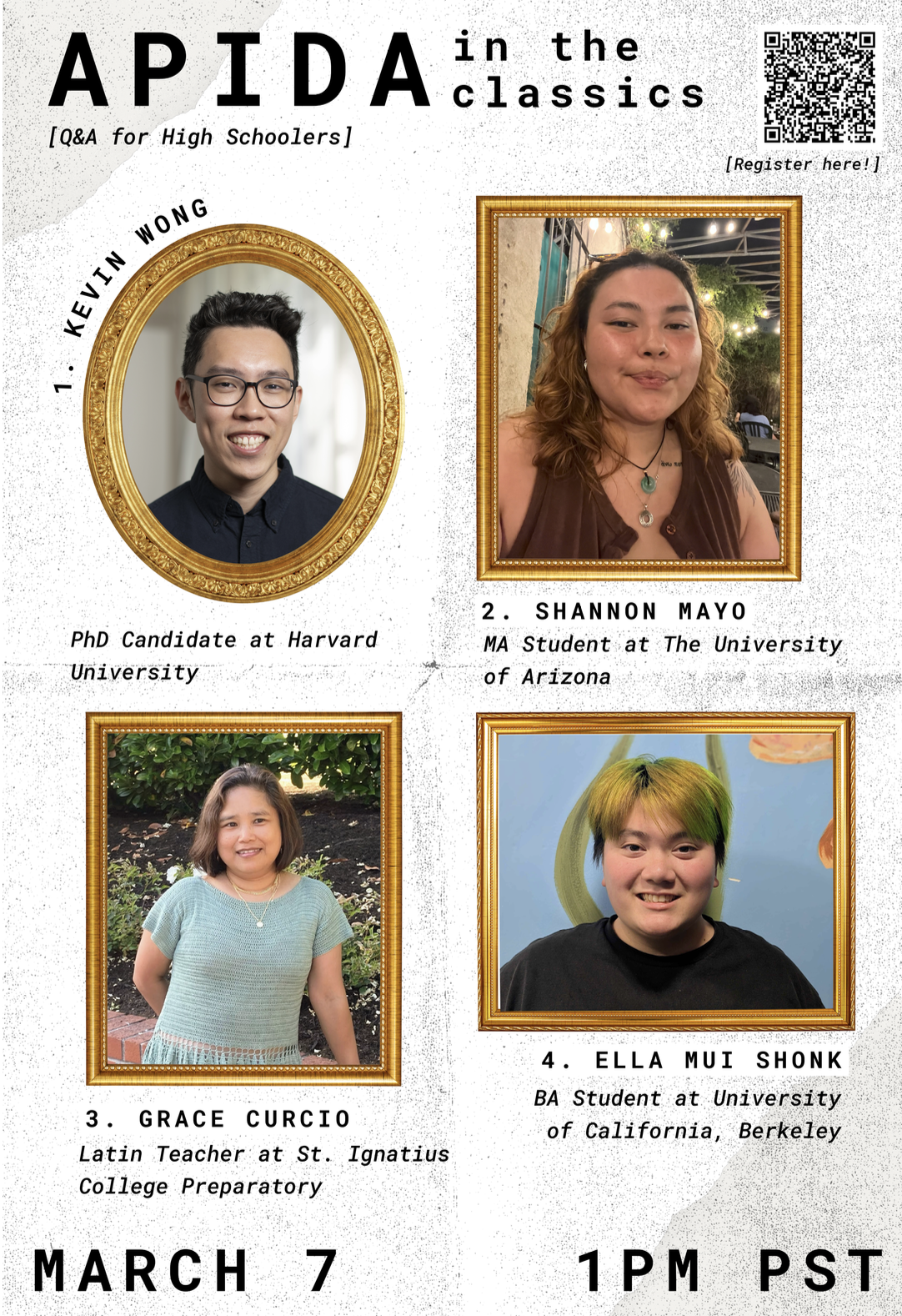 We invite high school students interested in Classics, particularly those who identify as APIDA (Asian, Asian American, Pacific Islander, and/or Desi American), to register for this free virtual event on Saturday March 7, 2026, 1pm PST/4pm EST. The event will be held on Zoom.